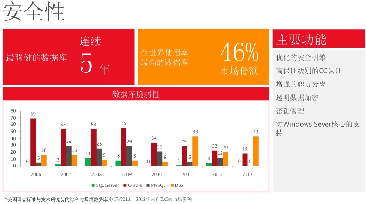 通过内置的突破式内存驻留技术,SQL Server 2014 能为要求最高的数据库应用提供关键业务所需性能 内存驻留技术,性能最高提升 30 倍;高可用性,满足您对高可用性的要求;增强安全性与扩展性,连续 5 年漏洞数量业界最少;关键业务支撑,最广泛覆盖率;用混合式解决方案应对数据激增;Edgenet 性能提升了 7 倍。